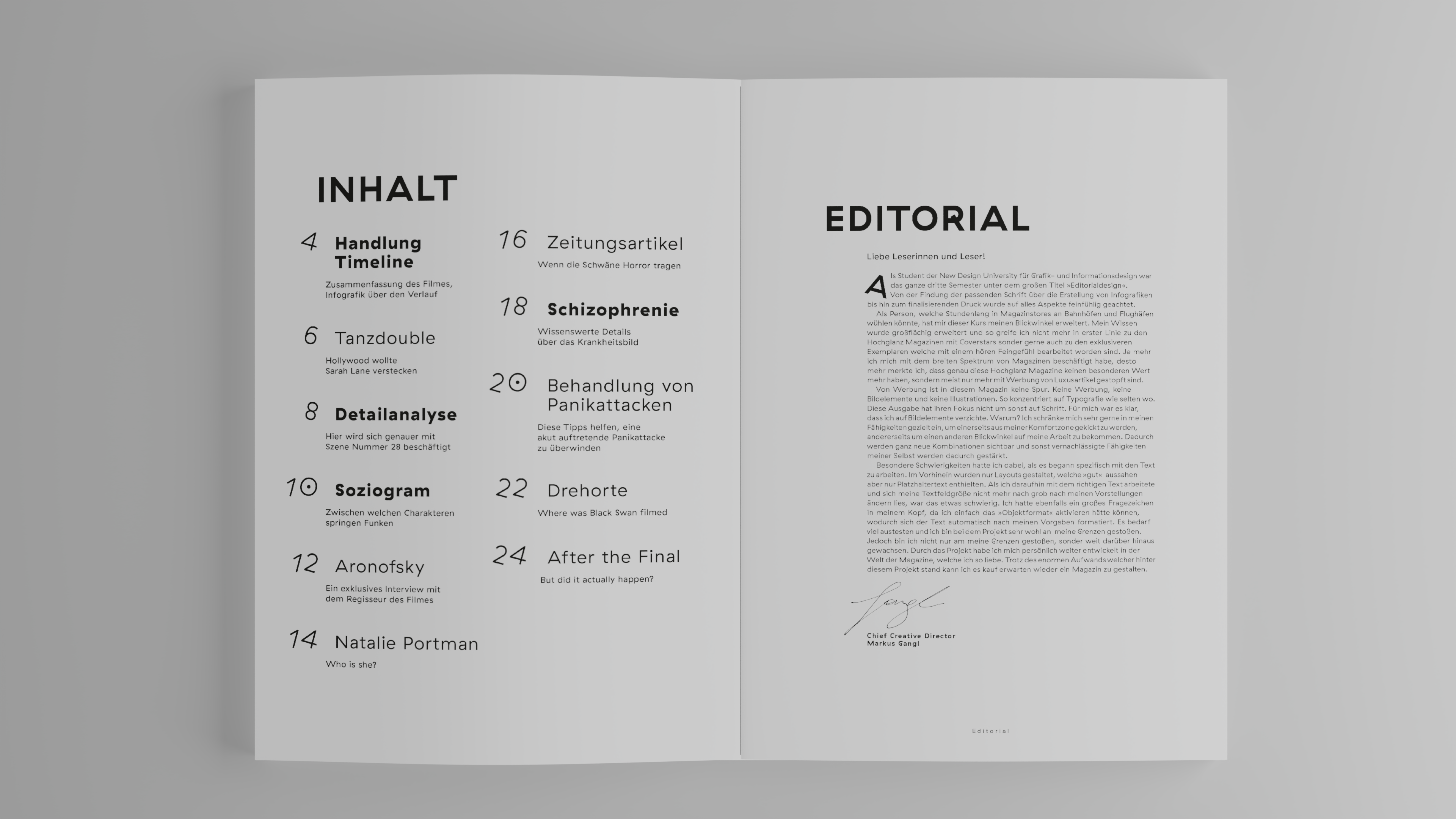 Immerse yourself in the mesmerizing world of »Black Swan« through this extraordinary editorial design project, where artistry and storytelling intertwine to create an unforgettable reading experience.